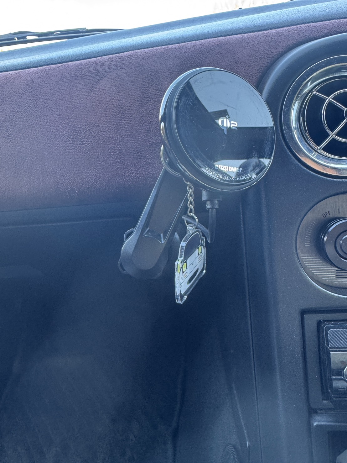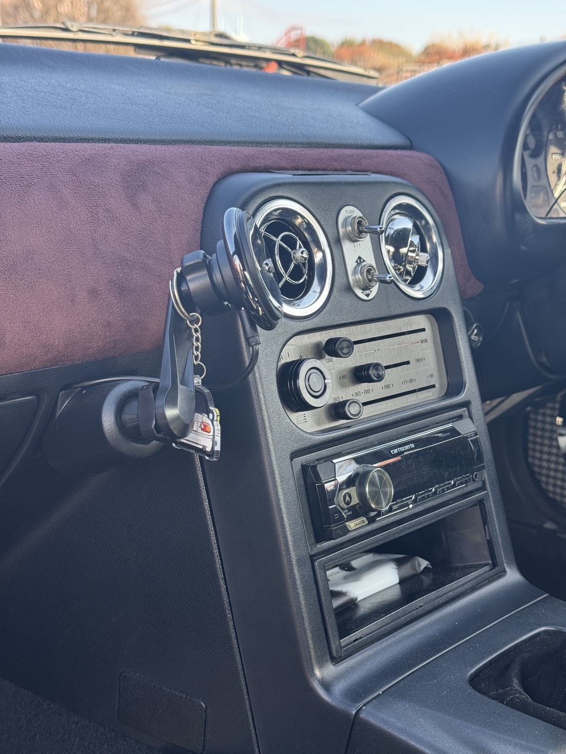 こちらのスマホスタンドは、NAロードスターの助手席側にある足元灯の穴を使って取り付けます。