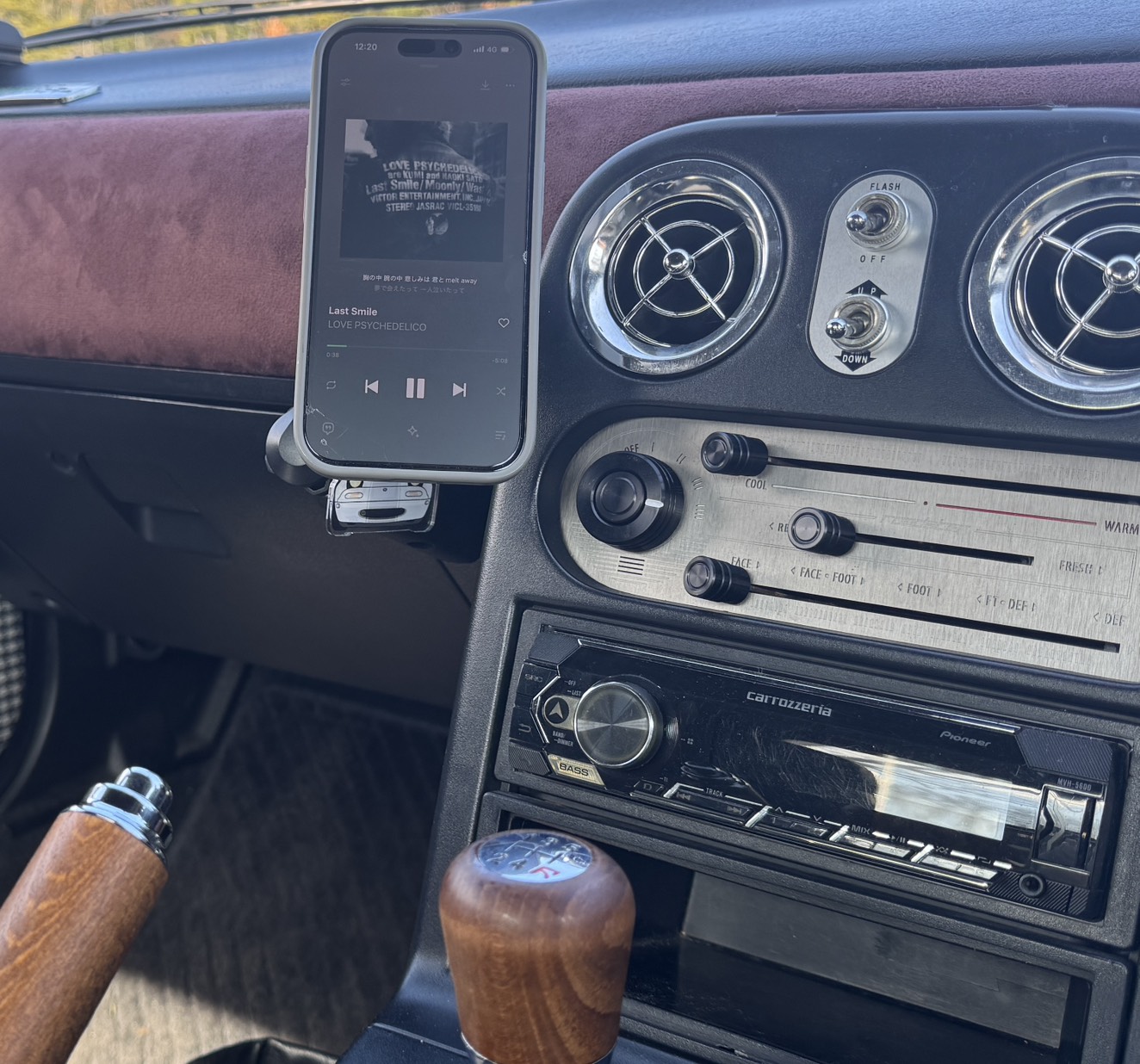 ただ、このスマホスタンドは左ハンドル用に作られているため、右ハンドル車につけるとスマホがこちらを向き切らない、、、