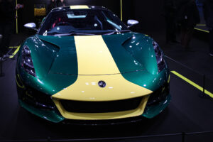 ロータスブースには最新の「ロータス・エミーラ」が展示されていましたが、そのカラーリングには特徴と「見覚え」がありました。